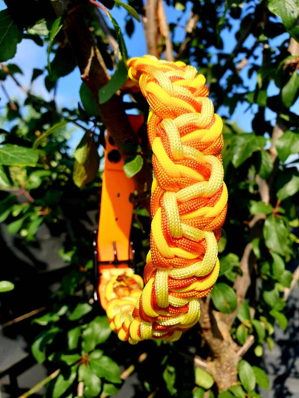 - sangle réglable en biothane (force de rupture 454kg), la couleur de la sangle sera choisie pour être assortie aux couleurs de paracorde choisies