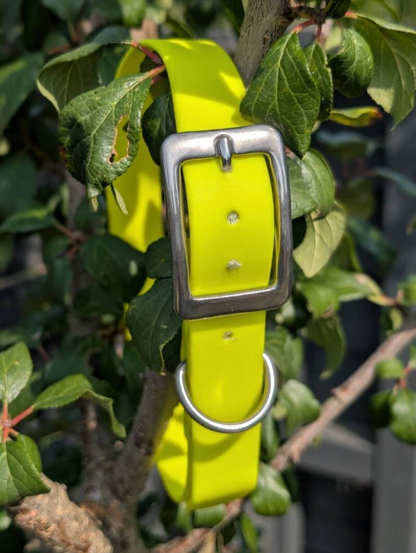 Collier REGLABLE en biothane imperméable fait main, jaune fluo pour une grande visibilité !