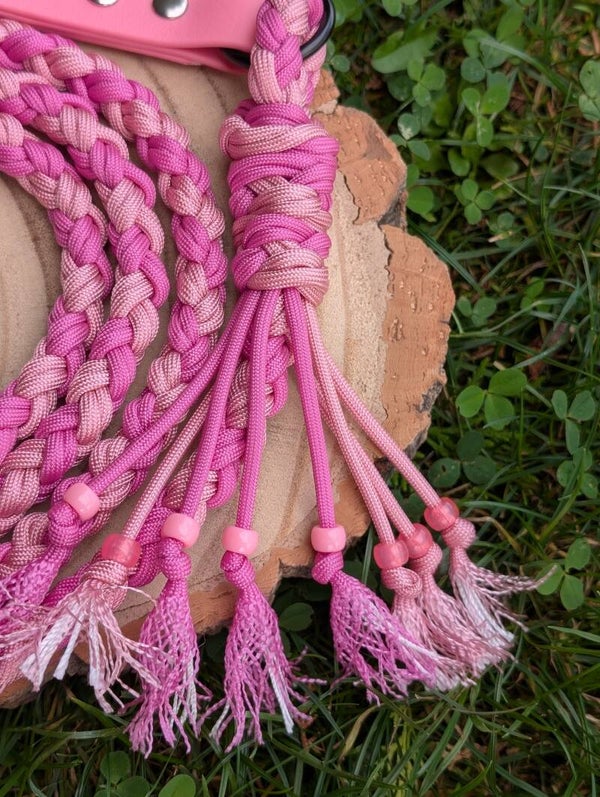 Laisse en paracorde faite main avec poignée en biothane, aux deux nuances de rose
